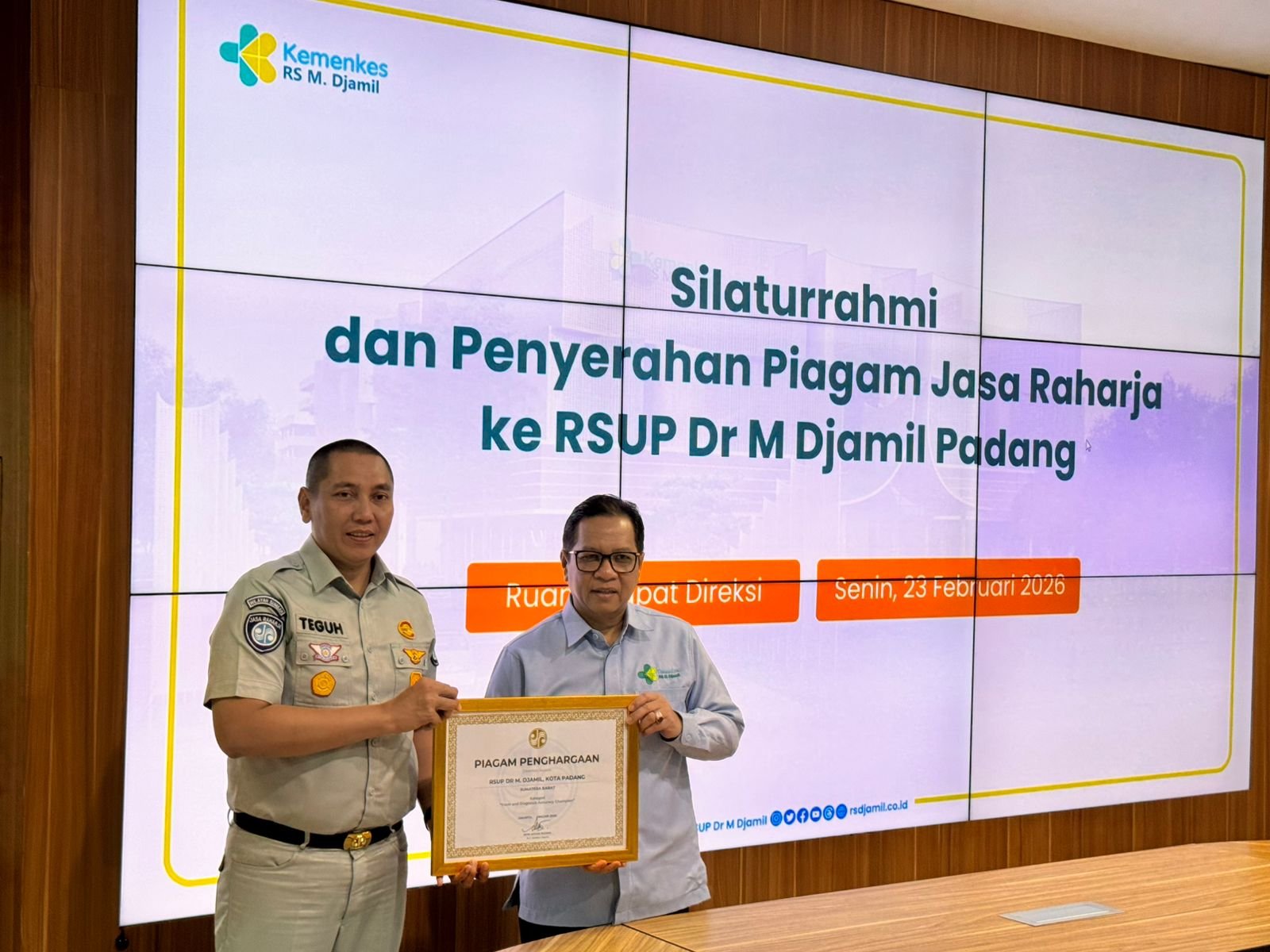 Padang – PT Jasa Raharja Kantor Wilayah Sumatera Barat melaksanakan kegiatan silaturahmi sekaligus penyerahan piagam penghargaan kepada RSUP Dr. M. Djamil Padang, Senin (23/2). Piagam penghargaan tersebut diserahkan langsung oleh Kepala Kantor Wilayah PT Jasa Raharja Sumatera Barat sebagai bentuk apresiasi atas komitmen rumah sakit dalam memberikan pelayanan terbaik kepada korban kecelakaan lalu lintas.